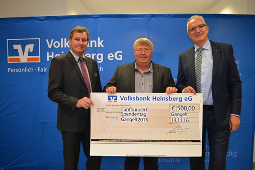 Das Vorstandsmitglied der Volksbank Heinsberg, Thomas Giessing, und Filialleiter Frank Dohmen haben uns anlässlich des jährlich in Gangelt stattfindenden Spendentages in der Volksbank Heinsberg mit 500 Euro für unser ehrenamtliches Engagement belohnt. Bankdirektor Giessing war voll des Lobes für unseren Verein. Er betonte, dass viele Aufgaben ohne die Arbeit von Vereinen und gemeinnützigen Organisationen gar nicht mehr bewältigt werden könnten. Vor dem Hintergrund leerer öffentlicher Kassen sieht sich die Volksbank aufgrund der Verbundenheit mit den Menschen in der Region in der Pflicht, finanzielle Unterstützung zu leisten. "Praktisch als Belohnung für alle, die mit ihrem Einsatz das gesellschaftliche Leben attraktiv gestalten und sich ehrenamtlich sozialen und karitativen Aufgaben widmen", unterstrich Giessing die Intention der Spendenvergabe in seinem Haus. Das Foto zeigt unseren Vorsitzenden Hans-Peter Molls bei der Spendenübergabe mit dem Filialleiter Frank Dohmen (links) und Volksbank-Vorstandsmitglied Thomas Giessing (rechts).