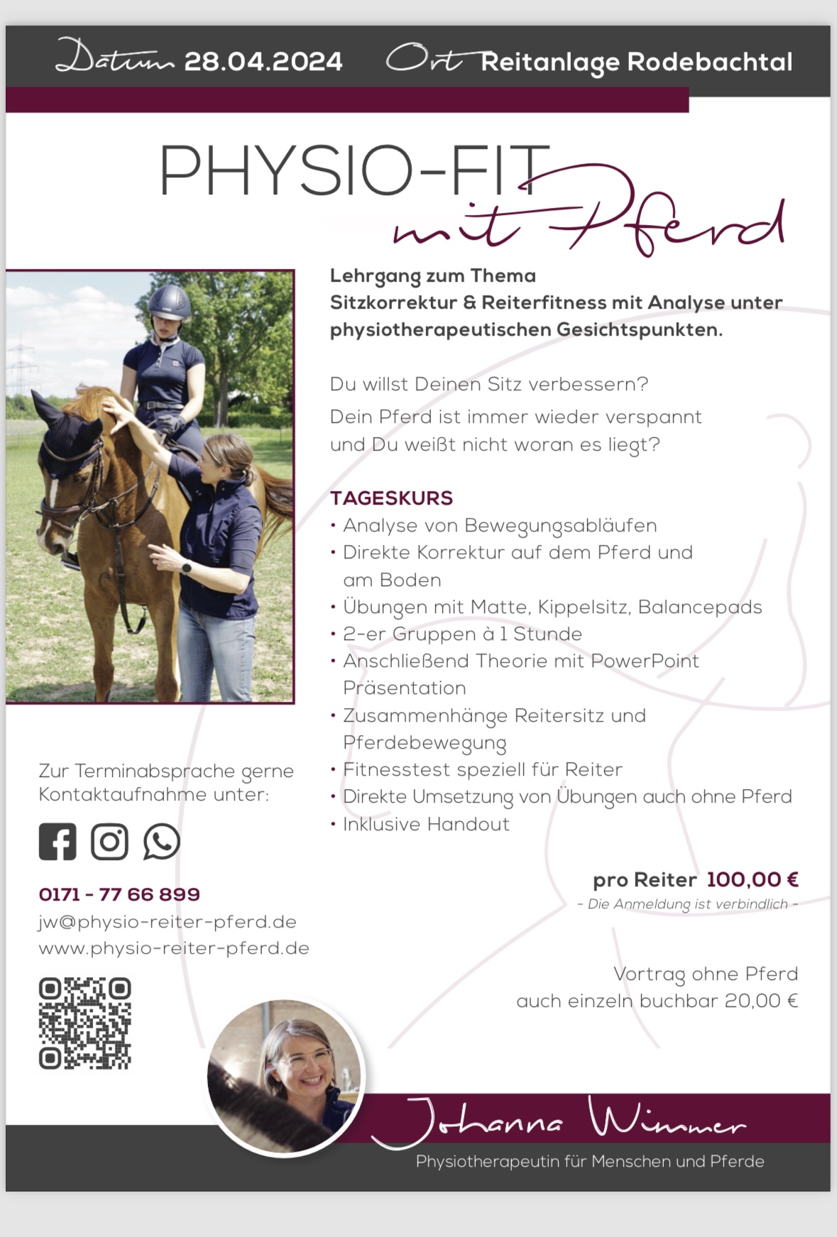 Physio-Fit mit Pferd 9 months ago By admin Am 28.4.24 findet der Lehrgang Sitzkorrektur & Reiterfitness mit Physiotherapeutin Johanna Wimmer statt. Anmeldungen siehe Kontaktformular. Anmelden, um Kommentare verfassen zu können